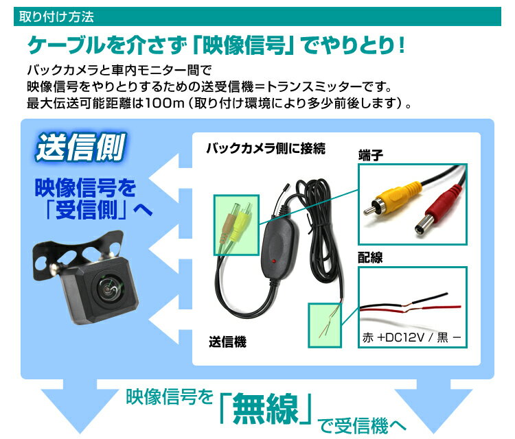 ) アイデア次第で用途いろいろできる! バックカメラに限らずヘッドレストモニターなど・・・ RCA映像ケーブルの映像ならどんなものでもワイヤレス接続可能! 商品仕様 サイズ(約):60×31×13cm 電源:DC12V用 理論値伝送距離:100m 送信側はカメラ用のφ5.5mmのオス電源端子搭載 映像入出力:RCA端子 転送電波周波数:2.4GHz ※取り付けの環境によって、伝送可能距離は異なります。